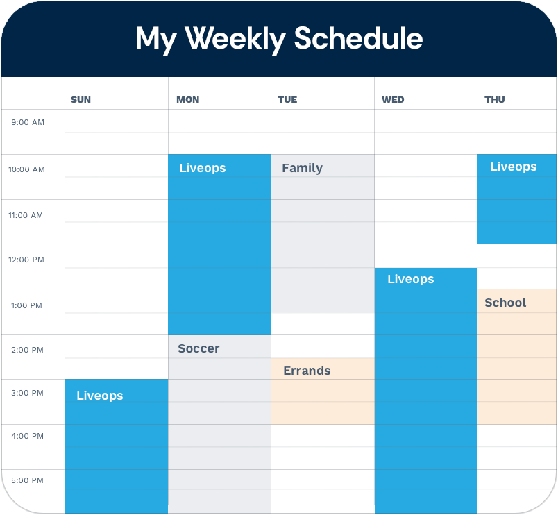 Life doesn’t always run on a schedule. Liveops online contact center opportunities put you in the driver’s seat, giving you the flexibility to be self-employed – set your own hours and work from anywhere in an eligible state.